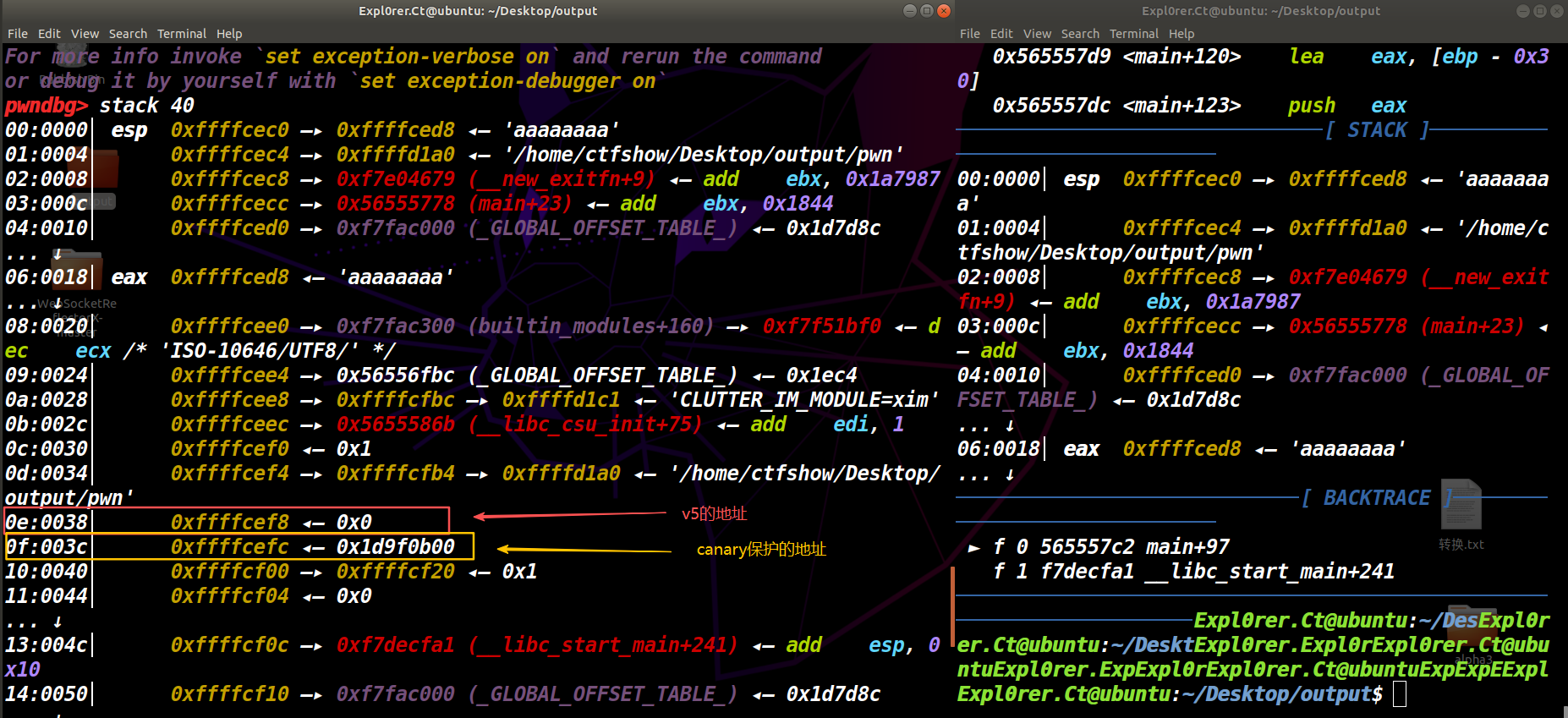 可以看到canary地址居然在v5地址之下,也就是说我们刻意栈溢出到v5,再溢出超过v5才会触发栈溢出保护。