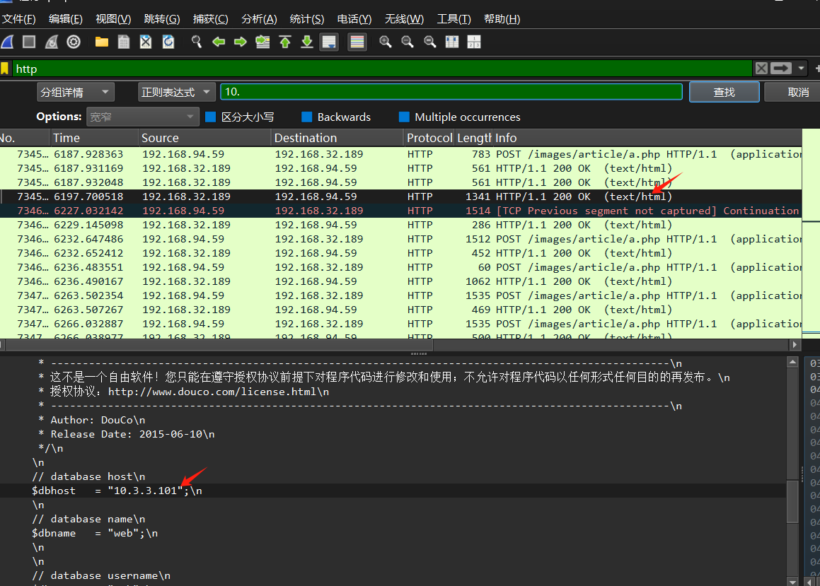 看了几个私人blog才知道内网是有固定ip开头,内网地址开头10.0、192.168.xxx的开头IP,那我们下一步可以搜索10字节流就可以找到答案了,不过也确实难找,第一次做。dbhost是data base host缩写,译为数据库主机。