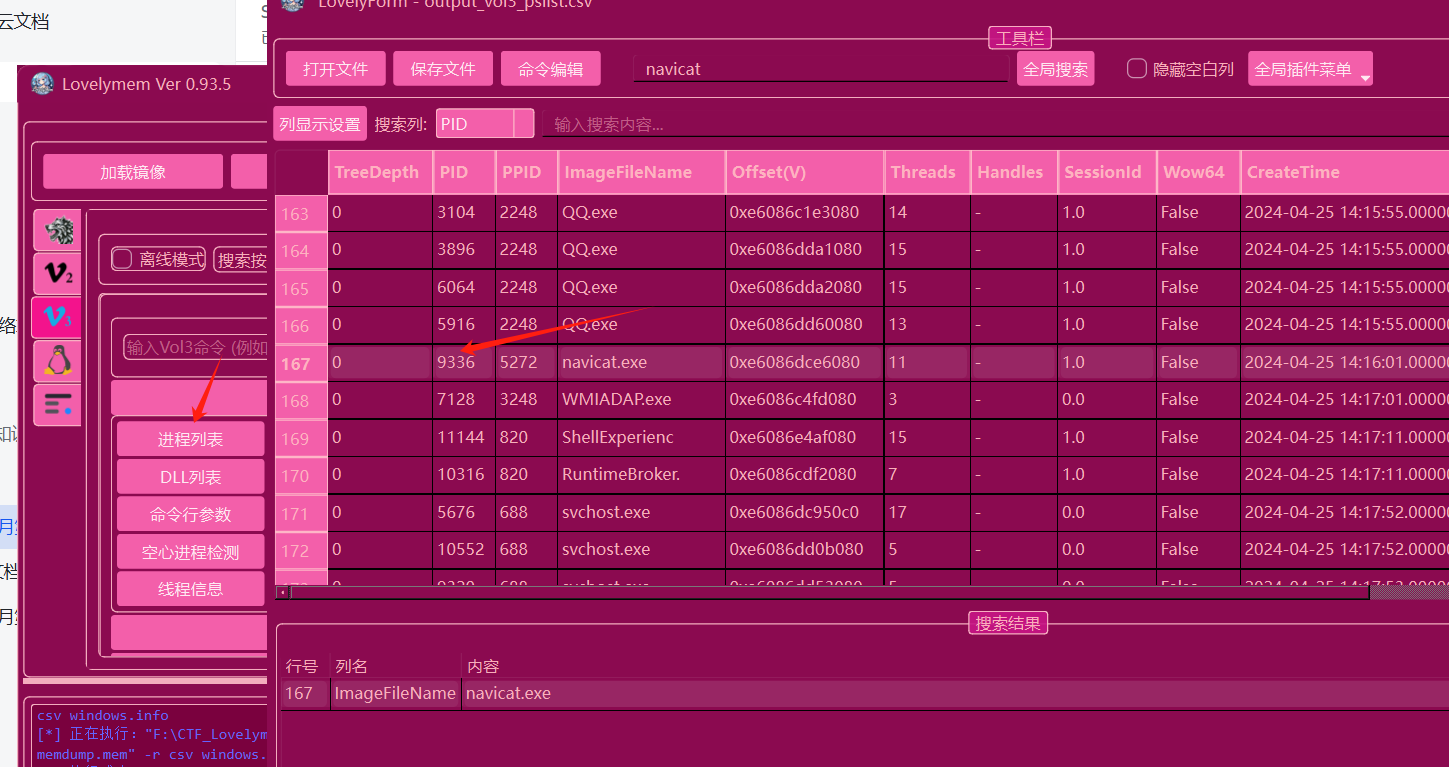 看navicat.exe进程,用volatility的plist进程指令查看