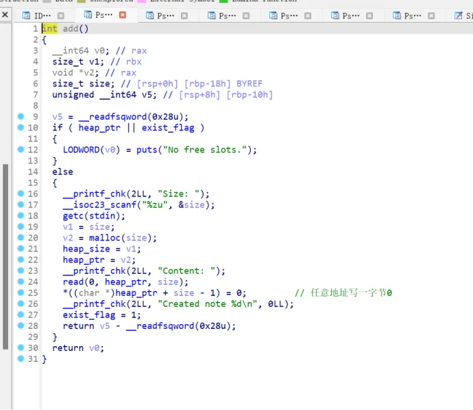 从 main 函数反编译代码可知,程序是一个典型的 “笔记管理系统”,提供以下功能: