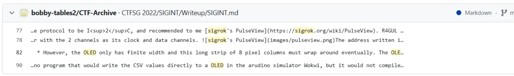 sr 文件是 zip 文件(用010editor分析就可以看到,504B压缩包文件头标识),解压出来 metadata 看到 sigrok version=0.5.2,在 GitHub 以 oled sigrok 为关键词找到原题 CTFSG 2022