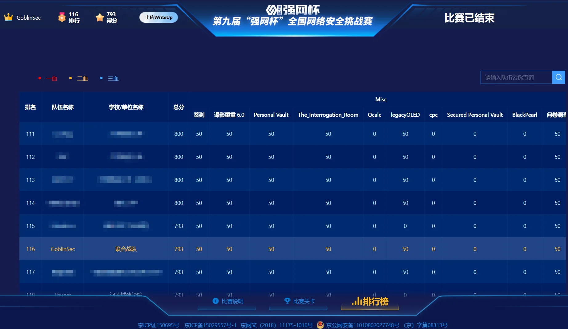 本以为能冲线下的,无奈实力不够,止步于全国116名,拿了793分(干掉14题,6题MISC、1题Reverse、2题PWN、4题Web、1题Crypto)。