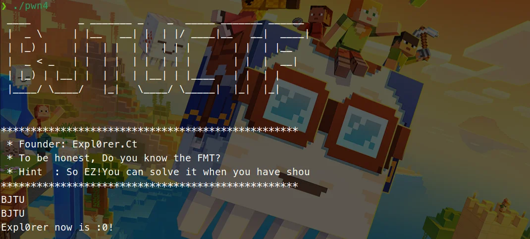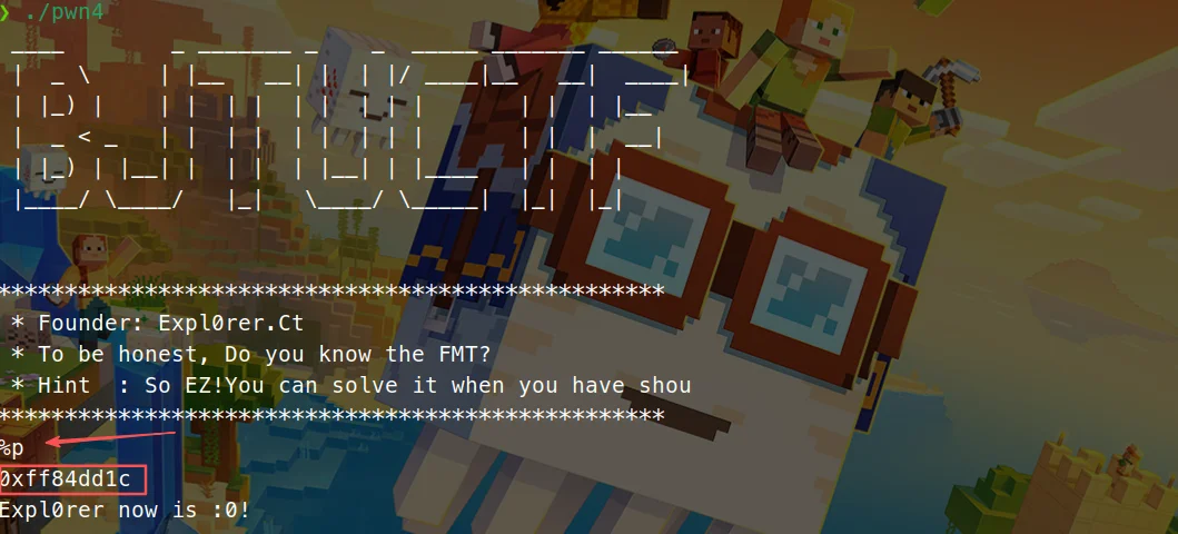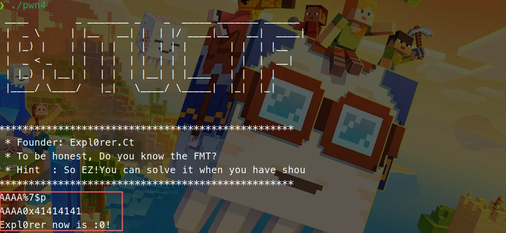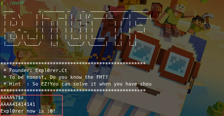 我们需要让Expl0rer = 6,现在又有格式化字符串漏洞,我们就可以使用其任意地址写功能将Expl0rer的值修改为6即可获得shell。