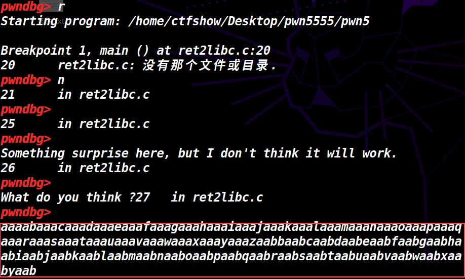 输入n(next),一步步执行程序,直到指针指向gets函数需要我们输入字符串的时候: