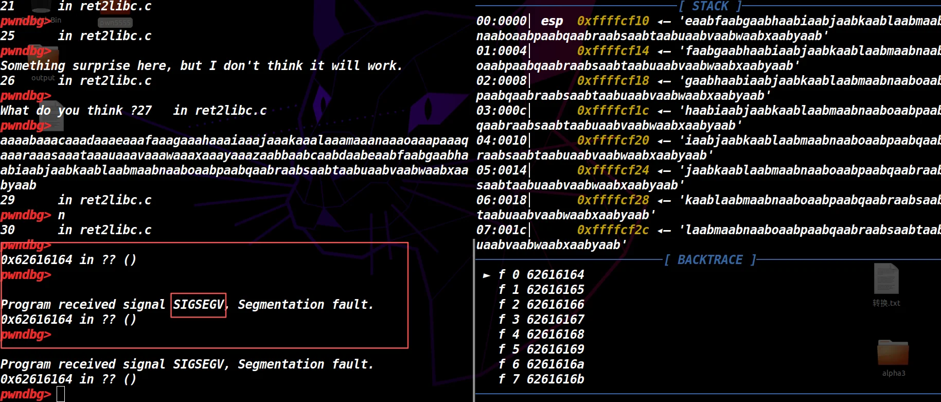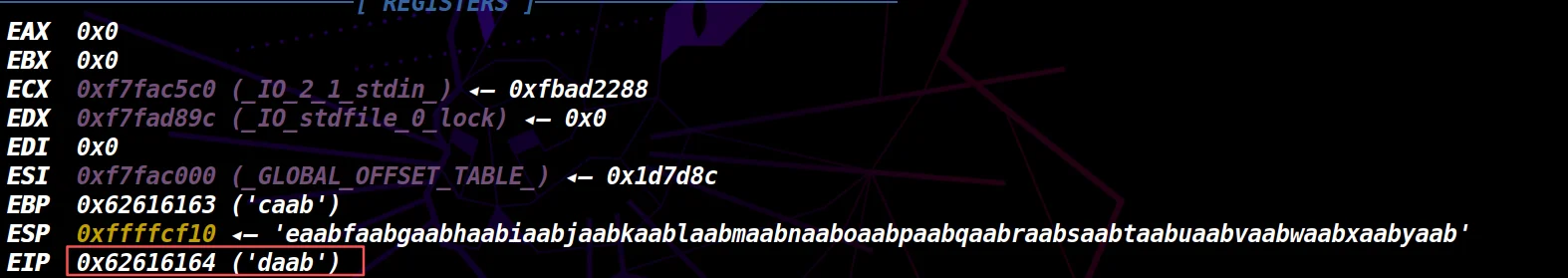 1 2 3 4 5 6 7 8 9 10 11 12 13 14 15 16 17 18 19 20 21 22 23 24 25 26 27 28 29 30 31 32 33──────────────────────────[ REGISTERS ]────────────────────────── EAX 0x0 EBX 0x0 ECX 0xf7fac5c0 (_IO_2_1_stdin_) ◂— 0xfbad2288 EDX 0xf7fad89c (_IO_stdfile_0_lock) ◂— 0x0 EDI 0x0 ESI 0xf7fac000 (_GLOBAL_OFFSET_TABLE_) ◂— 0x1d7d8c EBP 0x62616163 ('caab') ESP 0xffffcf10 ◂— 'eaabfaabgaabhaabiaabjaabkaablaabmaabnaaboaabpaabqaabraabsaabtaabuaabvaabwaabxaabyaab' EIP 0x62616164 ('daab') ───────────────────────────[ DISASM ]──────────────────────────── Invalid address 0x62616164 ────────────────────────────[ STACK ]──────────────────────────── 00:0000│ esp 0xffffcf10 ◂— 'eaabfaabgaabhaabiaabjaabkaablaabmaabnaaboaabpaabqaabraabsaabtaabuaabvaabwaabxaabyaab' 01:0004│ 0xffffcf14 ◂— 'faabgaabhaabiaabjaabkaablaabmaabnaaboaabpaabqaabraabsaabtaabuaabvaabwaabxaabyaab' 02:0008│ 0xffffcf18 ◂— 'gaabhaabiaabjaabkaablaabmaabnaaboaabpaabqaabraabsaabtaabuaabvaabwaabxaabyaab' 03:000c│ 0xffffcf1c ◂— 'haabiaabjaabkaablaabmaabnaaboaabpaabqaabraabsaabtaabuaabvaabwaabxaabyaab' 04:0010│ 0xffffcf20 ◂— 'iaabjaabkaablaabmaabnaaboaabpaabqaabraabsaabtaabuaabvaabwaabxaabyaab' 05:0014│ 0xffffcf24 ◂— 'jaabkaablaabmaabnaaboaabpaabqaabraabsaabtaabuaabvaabwaabxaabyaab' 06:0018│ 0xffffcf28 ◂— 'kaablaabmaabnaaboaabpaabqaabraabsaabtaabuaabvaabwaabxaabyaab' 07:001c│ 0xffffcf2c ◂— 'laabmaabnaaboaabpaabqaabraabsaabtaabuaabvaabwaabxaabyaab' ──────────────────────────[ BACKTRACE ]────────────────────────── ► f 0 62616164 f 1 62616165 f 2 62616166 f 3 62616167 f 4 62616168 f 5 62616169 f 6 6261616a f 7 6261616b在利用