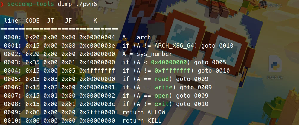 可以看到,只有 read,write,open,exit 可以使用,使用 open–>read–>write 这样的 orw 的方式。