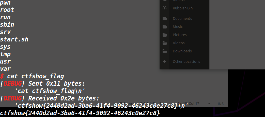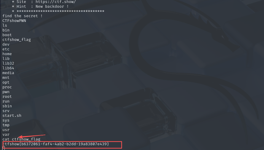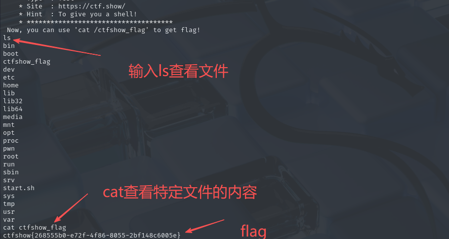 用命令ls打开看一下有啥文件,看到有个ctfshow_flag的文件,猜是个装flag的文件夹,直接用cat命令打开就好。注意斜杠/。