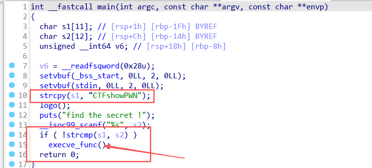 看到这段代码,大致意思是,让s1等于“CTFshowPWN”这段字符串,然后到if判断语句这进行比较:如果s1和s2相等(这里的!不是我们C语言中的“不”的意思啊),就执行execve函数,启动交互权限,从而得到flag。