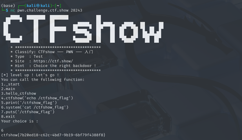 题目 PWN_001 :提供后门函数,连上即可得到flag