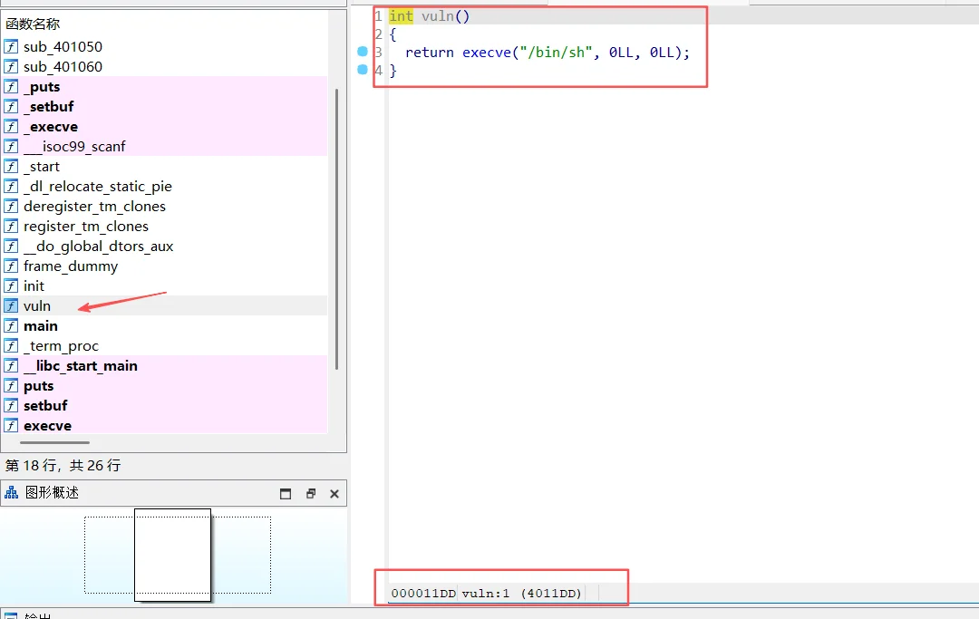 在函数目录看到了vuln函数: