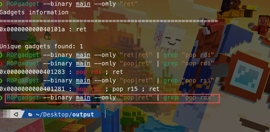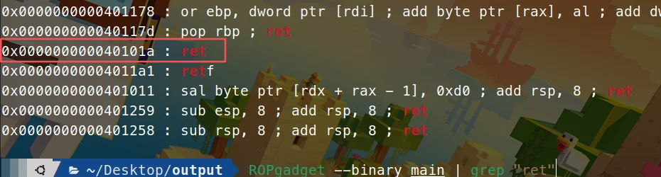 题目都给提示了,那就是构造ROP攻击链了,比较简单,多加个ret的gadget就可以了,用ROPgadget命令查询到ret的gadget地址: