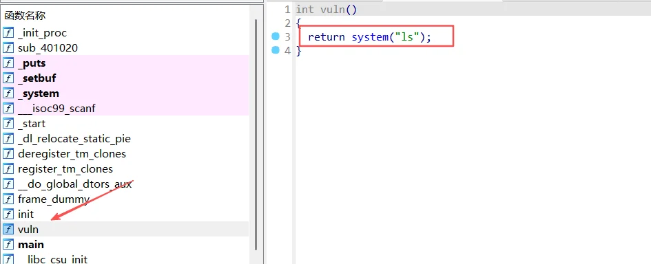 那我们在在栈溢出之后,用这个vuln地址覆盖返回地址,让程序返回到这个地址执行/bin/sh。