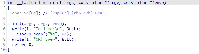io.recvuntil(b"No system now. Tell me!\n")