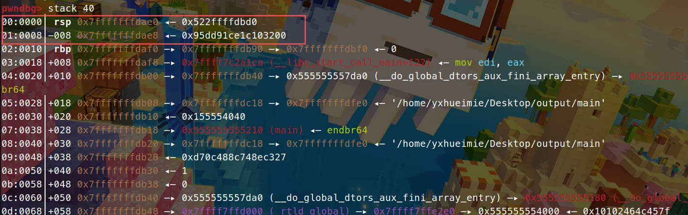 查看当前stack输出,0x7fffffffdae4这个地址没有直接显示在stack 40的条目里,但它位于两个显示条目之间: