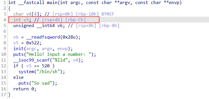 这题和上题不同的是,这回v5要等于“520”才能执行system函数,但v5再此前是被赋值位“1314”的,单靠我们输入字符给程序不能拿到flag,用其它手段去修改v5。
