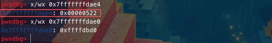 虽然stack命令没直接显示dae4,但可在pwndbg中用x命令直接查看该地址的v5值(指定int类型格式):