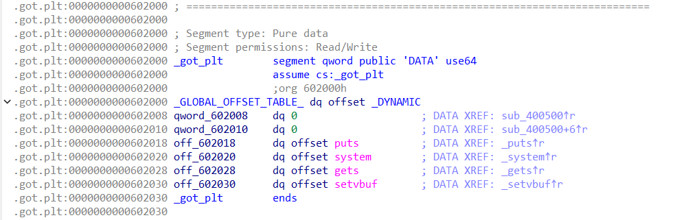 GOT的地址,在没开PIE的情况下,我们可以在IDA中查看,也可以用pwntools指令查询:elf.GOT[“puts”]
