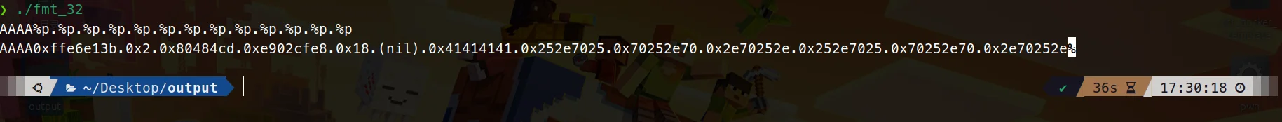 一个例子,在一个32位程序的栈上:%x$p将以16进制的方式输出。