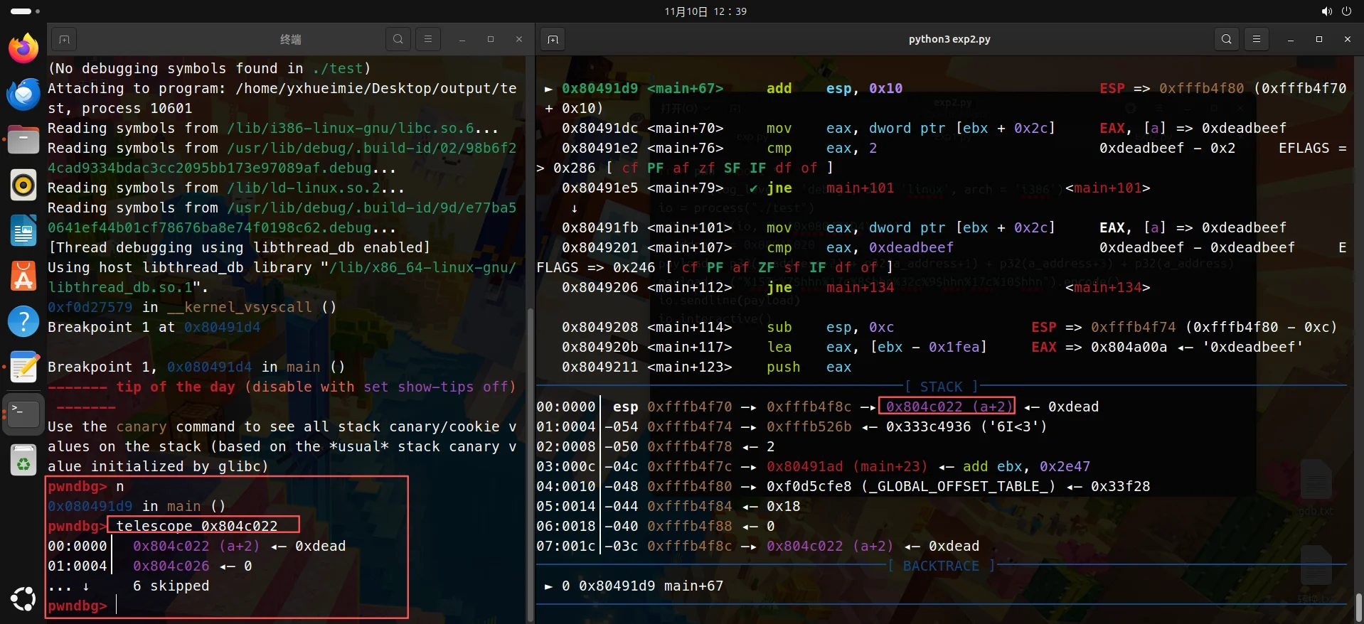 可以多试几次,地址是随机变化的,但都成功泄露出来了,后续就可以用u32函数打包赋值给一个变量进行储存。