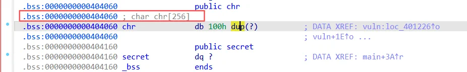 在IDA分析中,可以发现chr是全局变量不在栈上,在.bss字段上:
