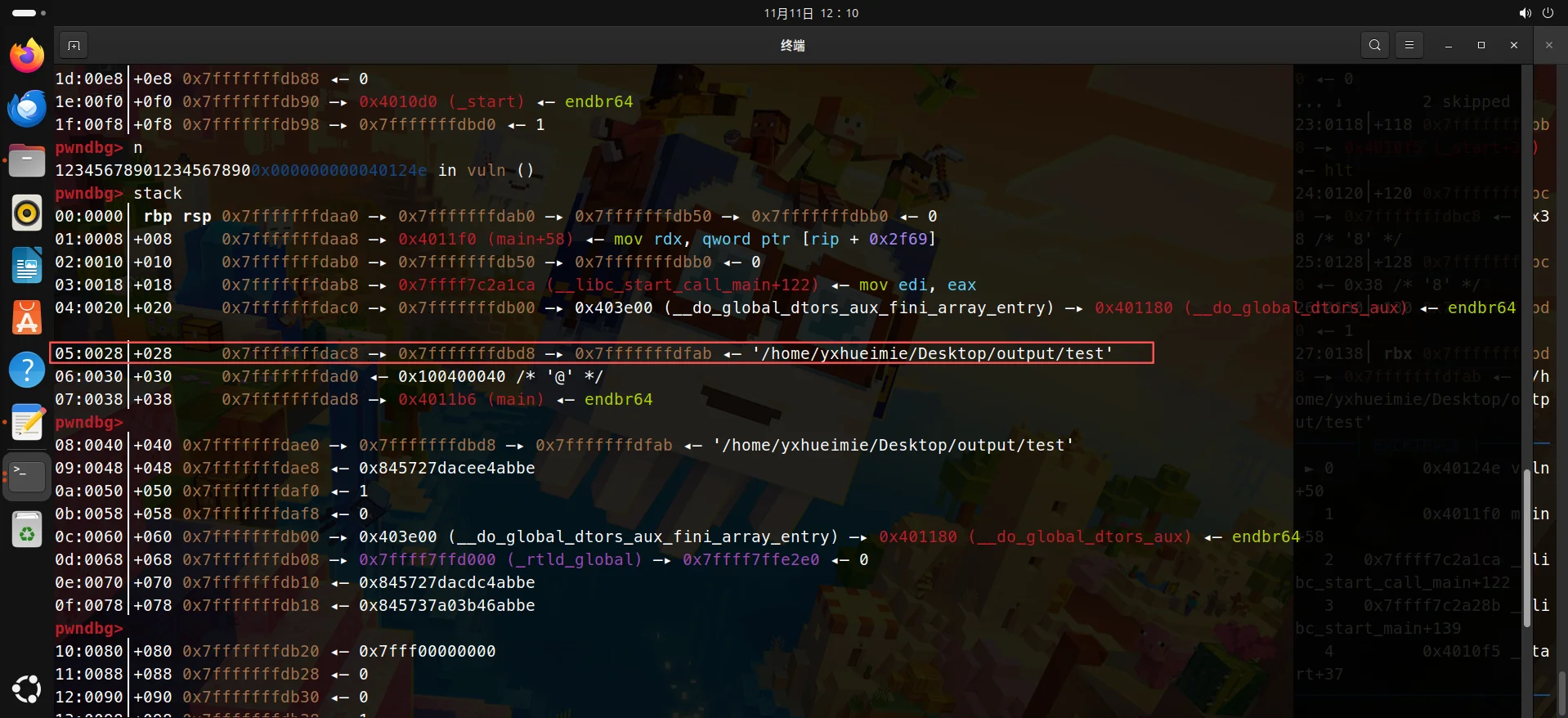 在0x28上注入了%2$p%3$p,利用printf就会输出0xFFFF12350xFFFF1236