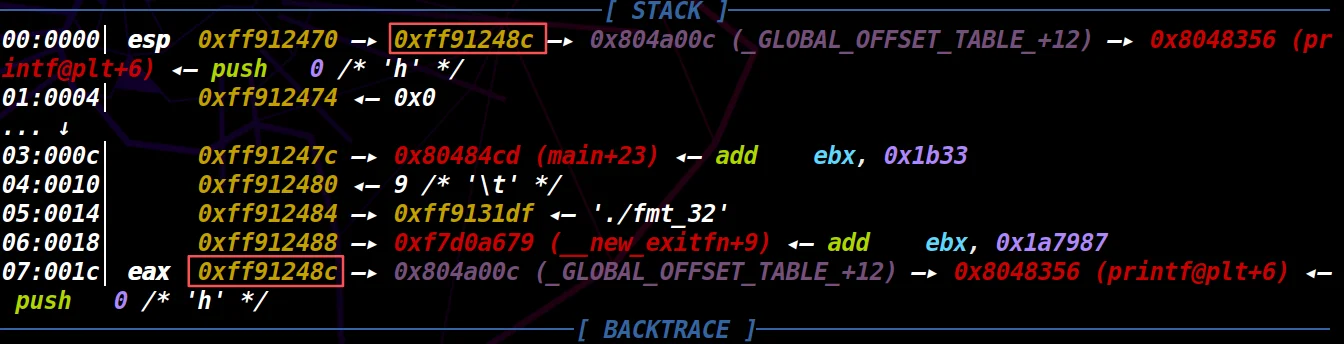 esp指向的内存地址是0xff912470(栈顶的第一个位置),这是栈上的一个地址。