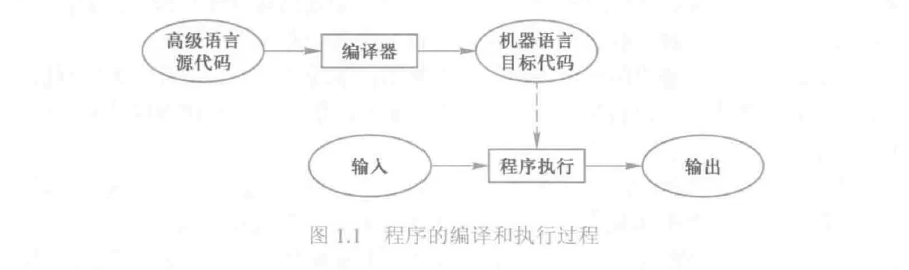 编译是将源代码转换成目标代码的过程,通常,源代码是高级语言代码,目标代码是机器语言代码,执行编译的计算机程序称为编译器(Compiler)。如图1.1展示了程序的编译过程,其中,虚线表示目标代码被计算机运行。编译器将源代码转换成目标代码,计算机可以立即或稍后运行这个目标代码。