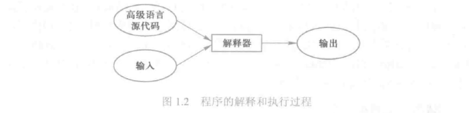 解释是将源代码逐条转换成目标代码同时逐条运行目标代码的过程。执行解释的计算机程序称为解释器(Interpreter)。如图1.2展示了程序的解释过程。其中,高级语言源代码与数据一同输入给解释器,然后输出运行结果。
