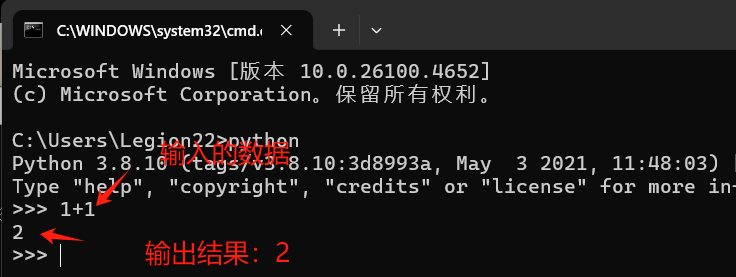 交互式有两种启动和运行方法。 第一种方法,启动Windows操作系统命令行工具(<Windows系统安装目录>\system32\cmd.exe),在控制台中输入“Python",在命令提示符»>后输入如下程序代码: